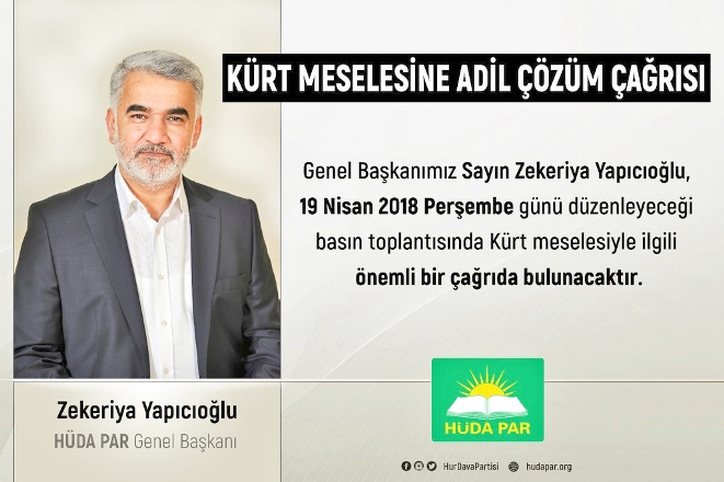 HÜDA PAR Genel Başkanı Zekeriya Yapıcıoğlu’nun katılımıyla bugün Diyarbakır Büyükşehir Öğretmen Evi’nde düzenleyecekleri "Kürt Meselesine Adil Çözüm Çağrısı" temalı basın toplantısına davetlerini ileten Kaya, Kürt sorunun çözümü noktasında tüm çevrelere bir çağrıda bulunacaklarını ifade etti.