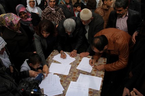 Grup adına açıklama yapan BDP İl Başkanı Zümrüt, bölge ve Türkiye'nin birçok merkezinde PKK Lideri Abdullah Öcalan için başlattıkları imza kampanyası kapsamında 10 milyon imza toplamayı hedefiyle çalışmalarını yürüttüklerini belirtti. Kampanya çerçevesinde her yerde imza stantları açtıklarını dile getiren Zümrüt, "Stantlarımıza yasaklama kararı çıkardılar. Çünkü korktular ve kampanyadan çıkan talebi görmemek için yasakladılar" diyerek ev ev, semt semt ve mahalle mahalle imza listelerini gezdirerek kampanyayı sürdüreceklerini söyledi.