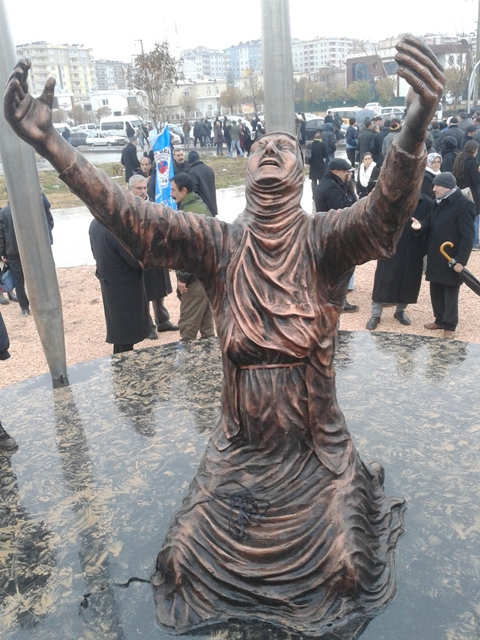 Anıtta, ağlayan bir annenin heykeli ve etrafında bombaları simgeleyen figürler ve 34 kişinin ismi yazılıydı.