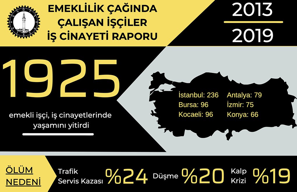 "Her 5 ‘emeklilik çağında çalışan işçi’den 1’i çalışırken kalp krizi geçirerek yaşamlarını yitirmekte. Salt 65 yaş ve üzeri yaşlı işçilere baktığımızda ise kalp krizi nedenli ölüm ilk sıraya çıkmaktadır. Kalp krizinin nedeni ağır çalışma koşulları olduğu gibi bu durum belli bir yaşın üstünde olan işçilerin (genel olarak halkın) sağlığına dair ülkemizin hiçbir politikasının olmadığını da gözler önüne sermektedir…