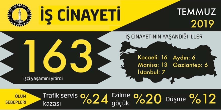 Ocak ayında en az 159 işçi, Şubat ayında en az 127 işçi, Mart ayında en az 114 işçi, Nisan ayında en az 153 işçi, Mayıs ayında en az 163 işçi, Haziran ayında en az 125 işçi ve Temmuz ayında en az 163 işçi olmak üzere; Türkiye’de 2019 yılının ilk yedi ayında en az 1004 işçinin iş cinayetlerinde yaşamını yitirdiği belirtildi.