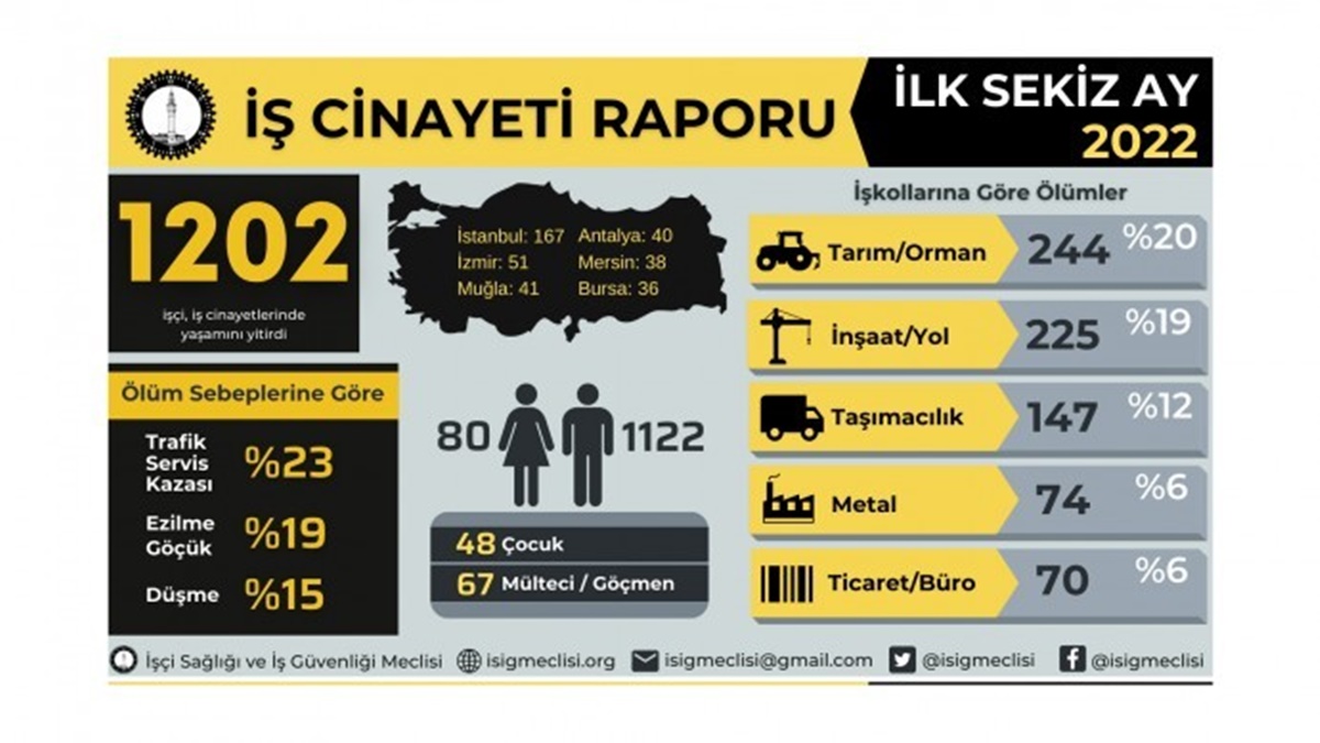 Raporda, Ocak ayında 120, Şubat ayında 109, Mart ayında 122, Nisan ayında 129, Mayıs ayında 176, Haziran ayında 189, Temmuz ayında 171 ve Ağustos ayında 186 işçi hayatını kaybettiği aktarıldı. Yaşanan ölümlerin en fazla tarım, inşaat, yol iş kollarında yaşandığı belirtildi. Ölenlerin sadece yüzde 2,99’nun sendikalı olduğu kaydedildi.