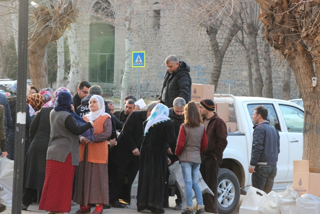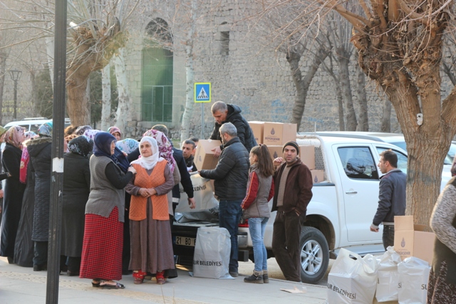 Diyarbakır’ın Sur İlçesi Belediyesine bağlı zabıta ekipleri, Sur mağdurlarına yardım kolisi dağıttı.