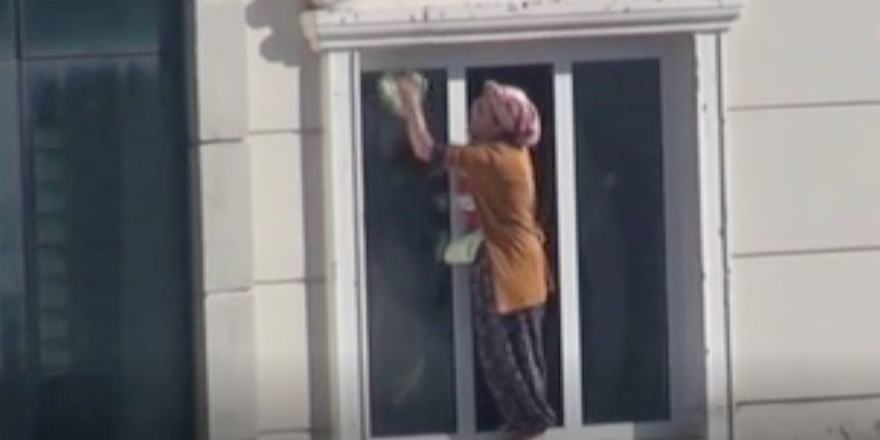 Gaziantep'te altında 7 katlı iş merkezinin 6'ncı katında cam silen kadın, görenlerin yüreğini ağzına getirdi.