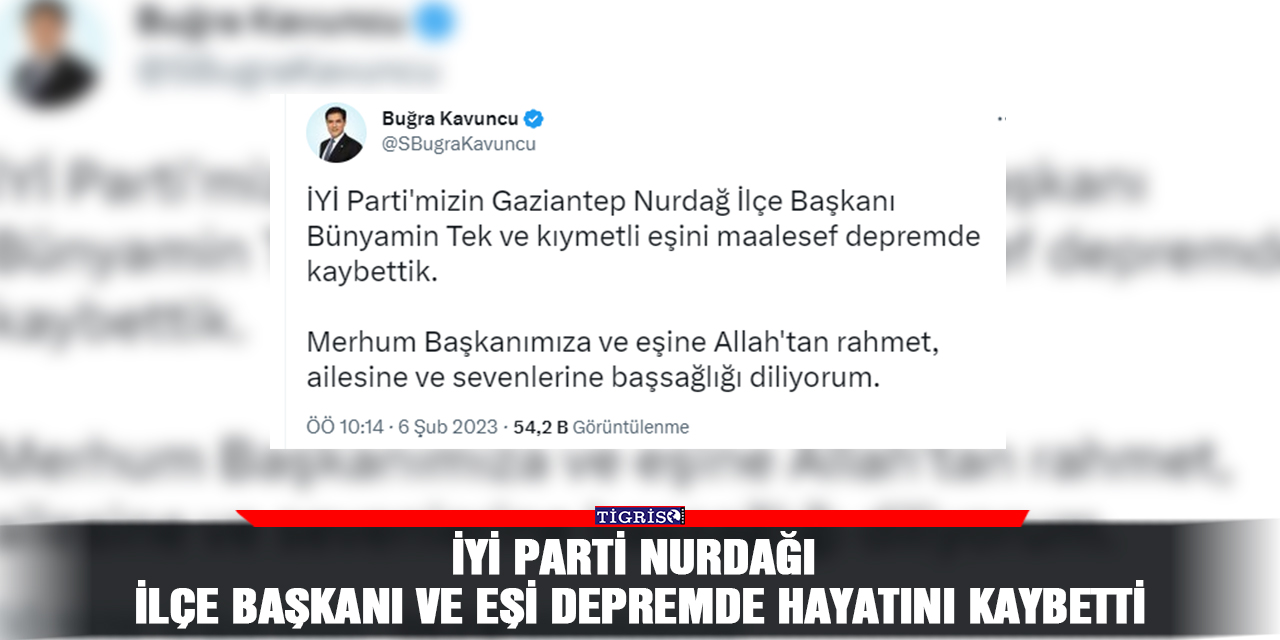 TİGRİS HABER - İYİ Parti Genel Başkan Başdanışmanı Buğra Kavuncu, sosyal medya hesabından yaptığı paylaşımda, Antep Nurdaği İlçe Başkanı Bünyamin Tek ve eşinin meydana gelen depremde hayatını kaybettiğini duyurdu.
