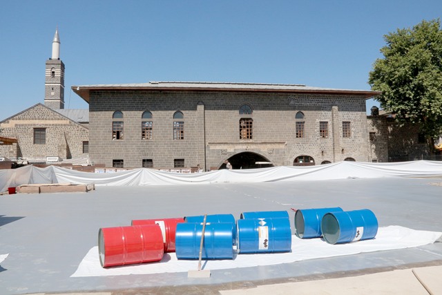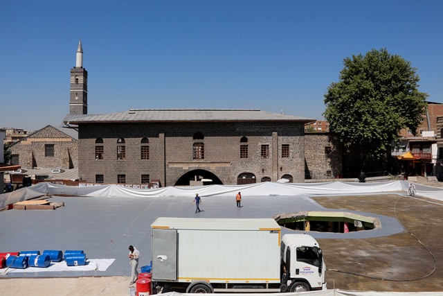 Restorasyon kapsamında tarihi Ulu Camii’nin önündeki alanın seviyesi düşürülerek düzlendi. Diyarbakır’a özgü bazalt taşlar ve mermerle kaplanacak olan alanda çalışmalar tüm hızıyla sürerken, alanın altındaki pasaja su sızmaması için zemine izolasyon yapıldı. Restorasyon alanında çalışan personellerden alınan bilgiye göre izolasyon malzemesinin Almanya’dan getirildiği ve sızdırmazlık kalitesinin çok yüksek olduğu belirtildi. İzolasyon işlemlerinin ardından alanın üzerine şap döküleceği ve sonrasında da Diyarbakır’a özgü bazal taşlar ve mermer ile alanın üzerinin kaplanacağı, görevli personeller tarafından belirtilirken, alanın en kısa zamanda hizmete açılacağı vurgulandı.