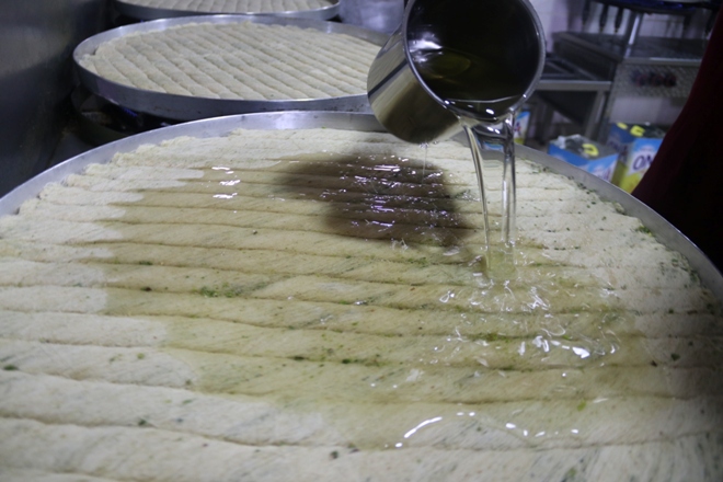 Kadayıf yapımı için hazırlanan hamurun 6 saat dinlendirildiğini ardından tel haline getirildiğini belirten Akduvar, "Tel halindeki hamurun içerisine fıstık, cevizli veya kaymak koyup ardından tepsiye diziyoruz. İki tarafını da pişirdikten sonra 45 dakika bekletip, hazırladığımız şerbetini döküyoruz." diye konuştu.
