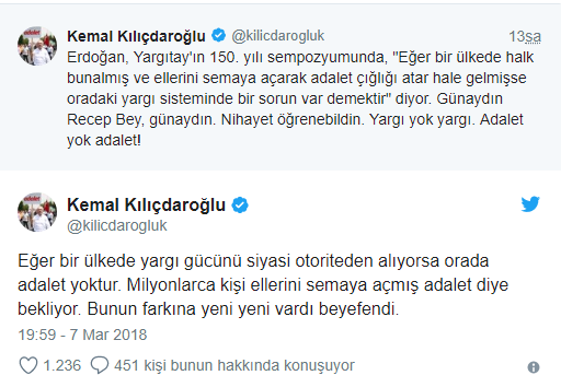 “Erdoğan, Yargıtay’ın 150. yılı sempozyumunda, “Eğer bir ülkede halk bunalmış ve ellerini semaya açarak adalet çığlığı atar hale gelmişse oradaki yargı sisteminde bir sorun var demektir” diyor. Günaydın Recep Bey, günaydın. Nihayet öğrenebildin. Yargı yok yargı. Adalet yok adalet!