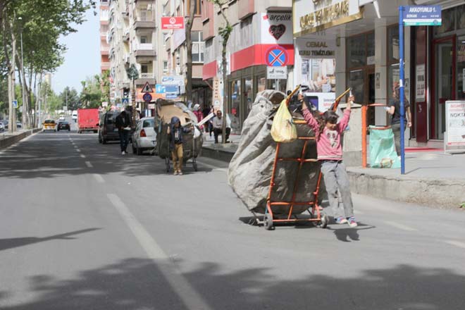 Ülkelerindeki iç savaş nedeniyle Suriye’den kaçıp Diyarbakır’a yerleşen bazı çocuklar ise, ailelerine katkı sağlamak için çöplerden kağıt ve naylon poşet topladı. 23 Nisan etkinliklerinden habersiz olan çocukların kendilerinden büyük çöp arabasını sürmeleri ve oyun oynamaları objektiflerimize böyle yansıdı.