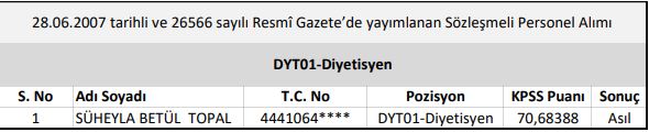 Söz konusu personel alımı 28 Haziran tarihinde resmi gazete yayımlandıktan sonra onlarca kişi açılan diyetisyenlik kadrosuna başvuruda bulundu. Yapılan başvuruların ardından onlarca diyetisyen adayı sonuçların açıklanmasını bekledi. Dicle Üniversitesi Personel Daire Başkanlığı bugün web sitesinden kadro alan kişileri açıkladı. Ancak iki kişilik kadroya sadece bir kişinin alındığı görüldü. Kadroya alınan kişinin ise Dicle Üniversitesi Eğitim Fakültesi Dekanı Giray Topal’ın kızı Süheyla Betül Topal olduğu ortaya çıktı. Topal’ın KPSS’den 70 puan aldığı öğrenildi. Böylelikle Diyetisyenlik kadrosu için açılan ilanın kraterlerini karşılayan tek kişi Dekan’ın kızı oldu.