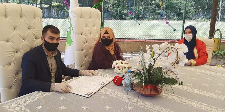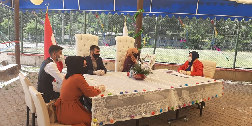 TİGRİS HABER - Bağlar Belediyesi, yeni normalleşme adımları kapsamında yeniden başlayan nikah törenleri ve işlemlerinde belediyelere örnek olacak bir uygulamaya imza attı. Belediyeye başvuran çiftlerin işlemleri yeni tip korona virüs tedbirleri ve sıcak havaya karşı açık alanda gerçekleştirilerek olası riskler için önlem alınıyor. Bağlar Belediye Başkanı Hüseyin Beyoğlu’nun göreve başladıktan sonra tamamlayarak modern hale getirdiği ek hizmet binasının bulunduğu açık alan ve bahçede gerçekleşen işlemlerde evlenecek olan çiftler, maske ve dezenfektan kontrolünden sonra sosyal mesafe kuralına uygun olarak nikah masasına oturup evliliğe adım atıyor.