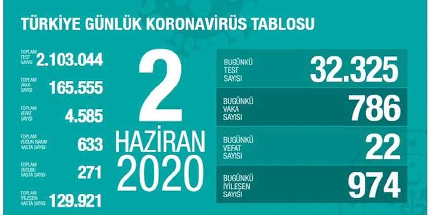 Sağlık Bakanlığından yapılan açıklamaya göre, son 24 saatte 22 kişi korona virüsten hayatını kaybetti, toplam can kaybı ise 4 bin 585'e yükseldi. Bugün toplam 32 bin 325 test yapılırken, 786 yeni vaka tanısı konuldu. Toplam vaka sayısı ise 165 bin 555 oldu. Bugünkü 974 kişiyle birlikte toplam iyileşen sayısı da 129 bin 921'e yükseldi. Toplam entübe hasta sayısının 271, toplam yoğun bakım hasta sayısının ise 633 olduğu açıklandı.