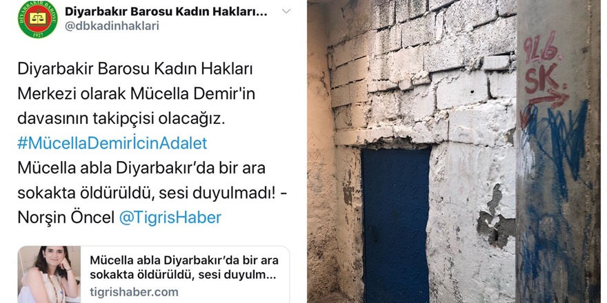 TİGRİS HABER - Mücella Demir, Diyarbakır’ın Merkez Bağlar ilçesinde 22 Temmuz 2020’de evli olduğu kişi tarafından öldürüldü. Mücella Demir cinayetine ilişkin Tigris Haber’de 24.07.2020 tarihinde yayınlanan ‘Mücella Abla Diyarbakır’da bir ara sokakta vuruldu, sesi duyulmadı’ köşe yazısı yankı getirdi. Diyarbakır Barosu Kadın Hakları Merkezi, sosyal medya hesabından: “Diyarbakir Barosu Kadın Hakları Merkezi olarak Mücella Demir'in davasının takipçisi olacağız. #MücellaDemirİcinAdalet” açıklamasında bulundu. (Haber Merkezi)