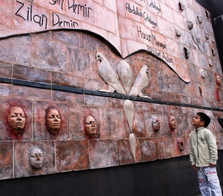 DİYARBAKIR - Diyarbakır Koşuyolu Parkı'nda 12 Eylül 2006’da 9’u çocuk 11 kişinin ölümünün ardından dikilen, "Yaşam Hakkı Anıtı" önünde bir araya gelen çocuklar, şaşkın gözlerle anıtı incelerken objektifimize takıldı.