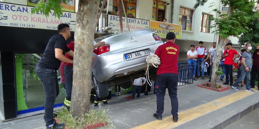 Diyarbakır’da bir otomobil, sürücüsünün hızla sokağa girmek istemesi sonucu merdivenlerden uçarak mağazanın önüne yuvarlandı. Kazada ölen ya da yaralanan olmazken, sürücü aracı bırakıp olay yerinden kaçtı.