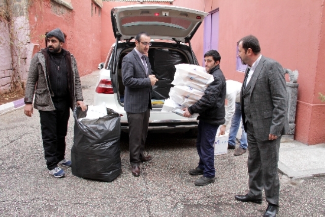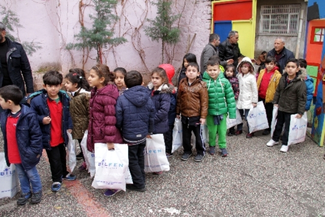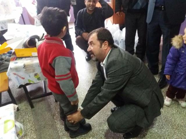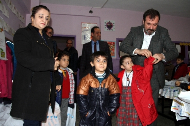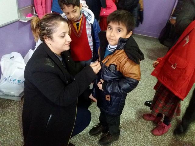 Ziyaretin sonunda Ekrem Karakoç ve Zuhal İpek,okuldaki mağdur çocukları kendi elleriyle giydirerek renkli görüntüler oluşturdu.