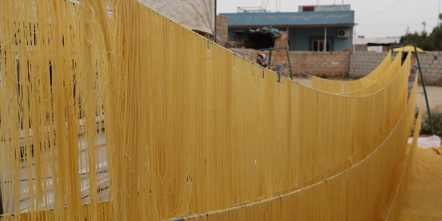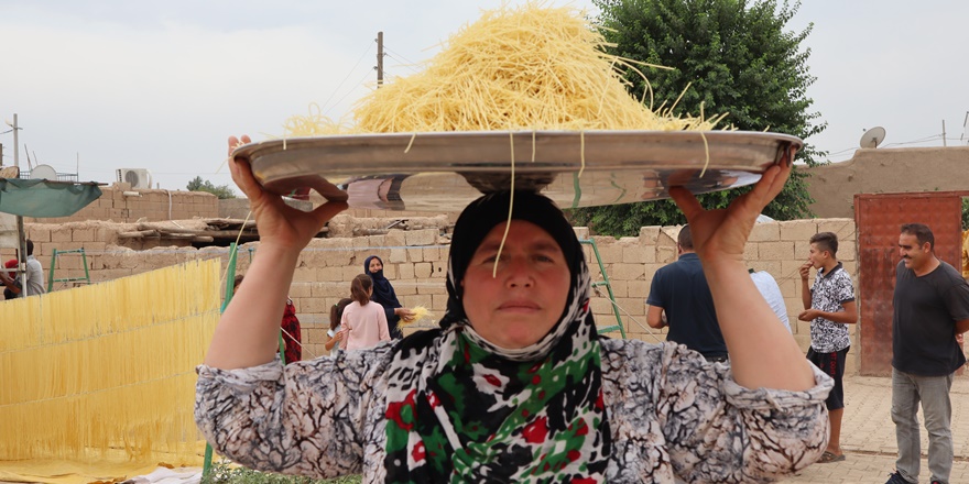 TİGRİS HABER - Kızıltepe’de halen birçok köyde fabrikasyon gıdalar kullanılmıyor. Kadınlar kendi salça, pul biber ve bulgurlarını evlerinin mutfağında üretiyor. Eşme köyünde kadınlar kışlık şehriye yapmaya başladı. Kadınlar köy meydanında kurulan seyyar makineyle ilk önce hamurlarını yoğuruyor. Ardından makineyle şehriye üretiliyor. Bu şehriyeler telin üzerinde kurutuluyor. Kuruyan şehriyeler bir süre damda bekletildikten sonra odun ateşinde seyyar fırında kavruluyor. Kadınlar son olarak bu şehriyeleri daha önce hazırladıkları bulgurla karıştırıyor. Bulgur ve şehriyelerin karışımından sonra sofraların vazgeçilmez yemeği olan bulgur pilavı hazırlanmış oluyor.