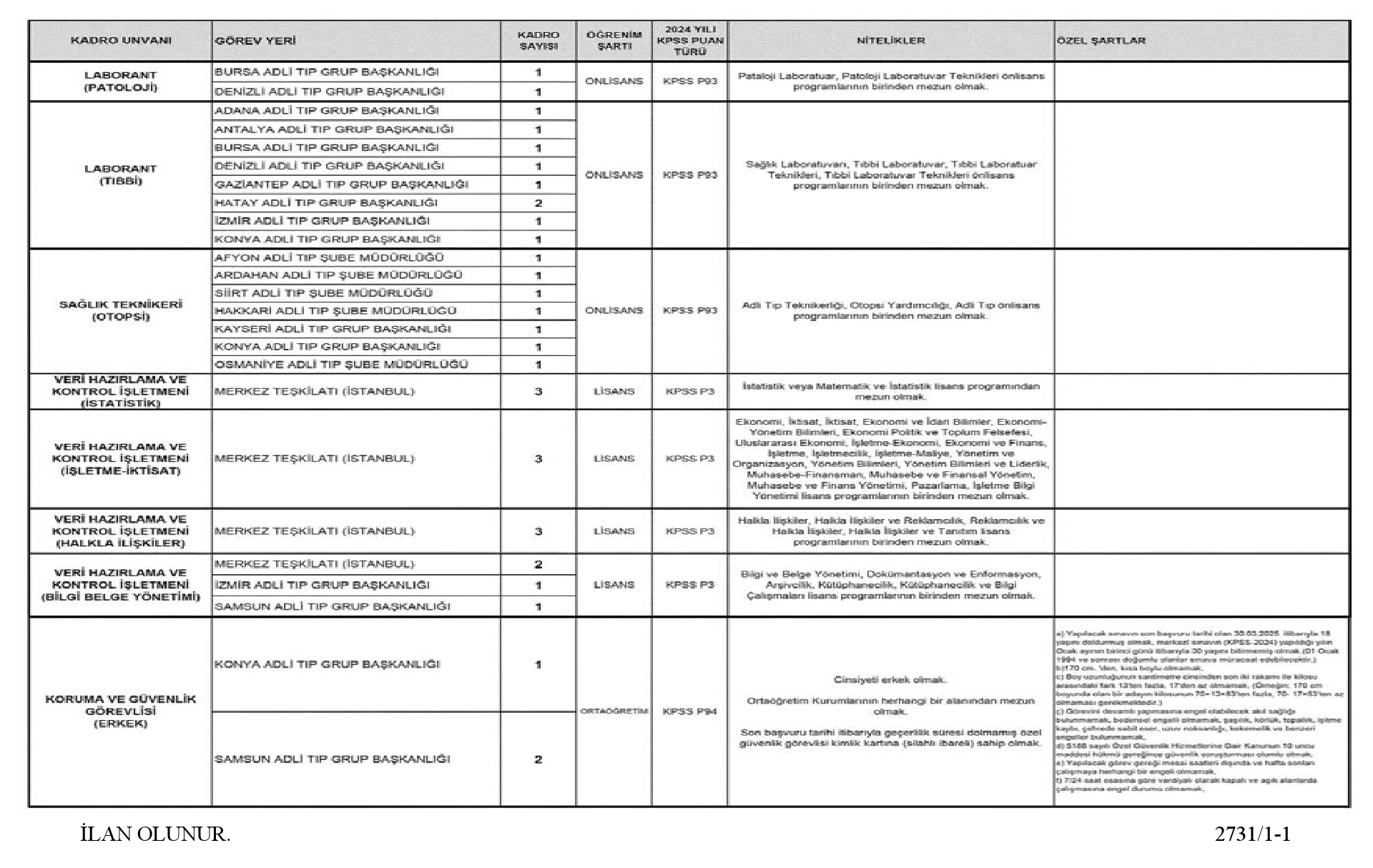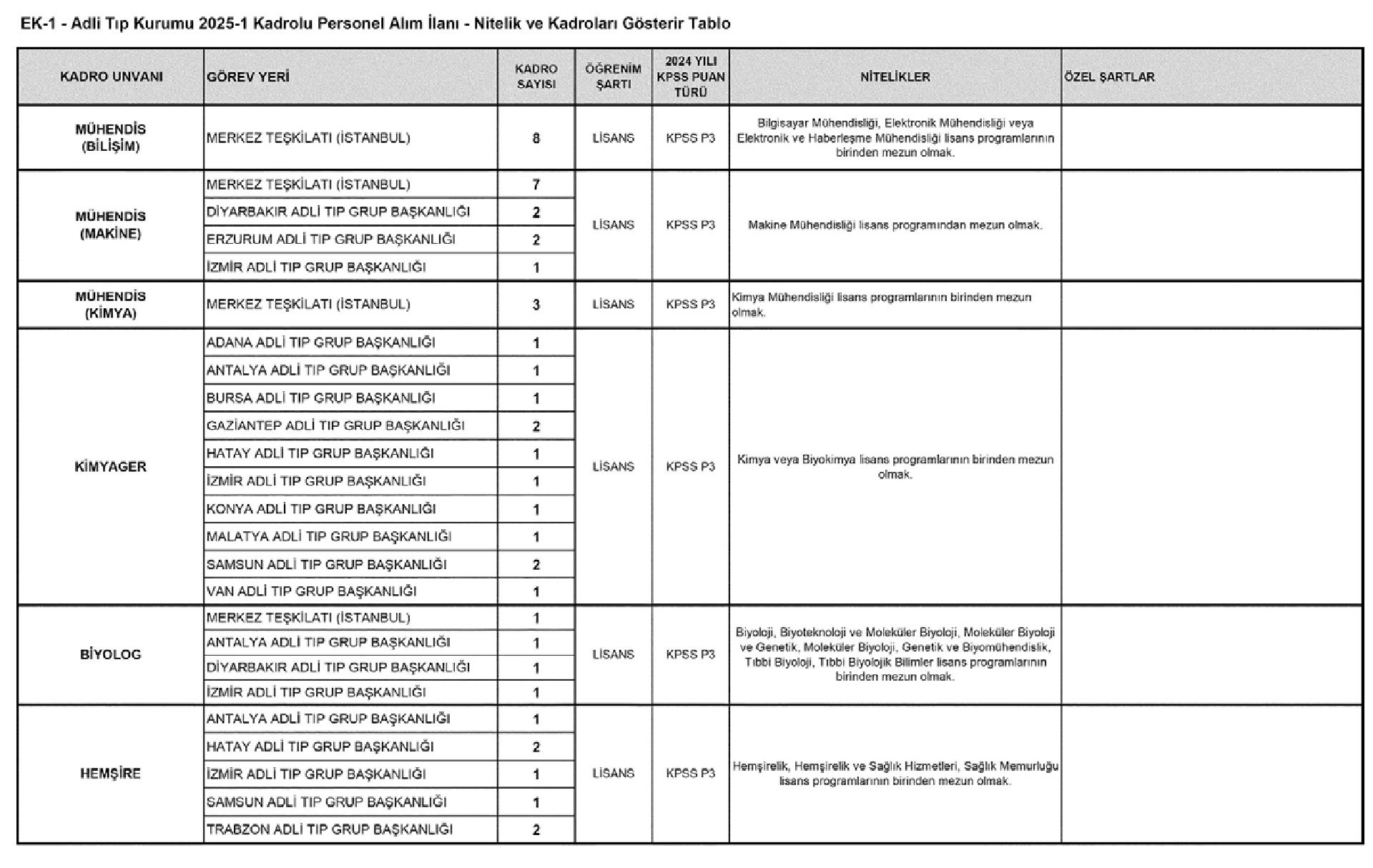 1) Adli Tıp Kurumu Merkez ve Taşra Teşkilatında görev yapmak üzere 657 sayılı Devlet Memurları Kanunu'nun 4/A maddesi uyarınca istihdam edilmek üzere;