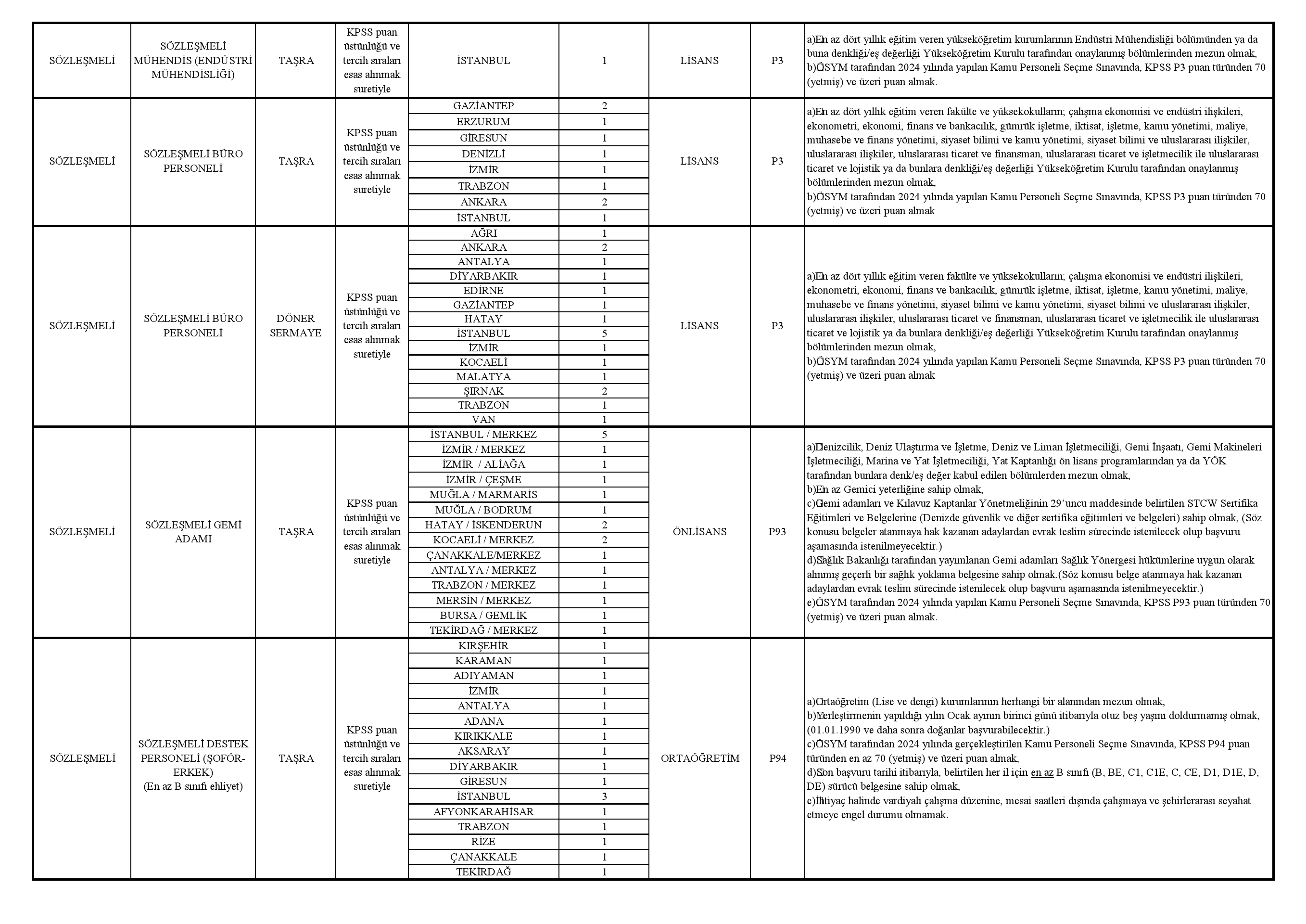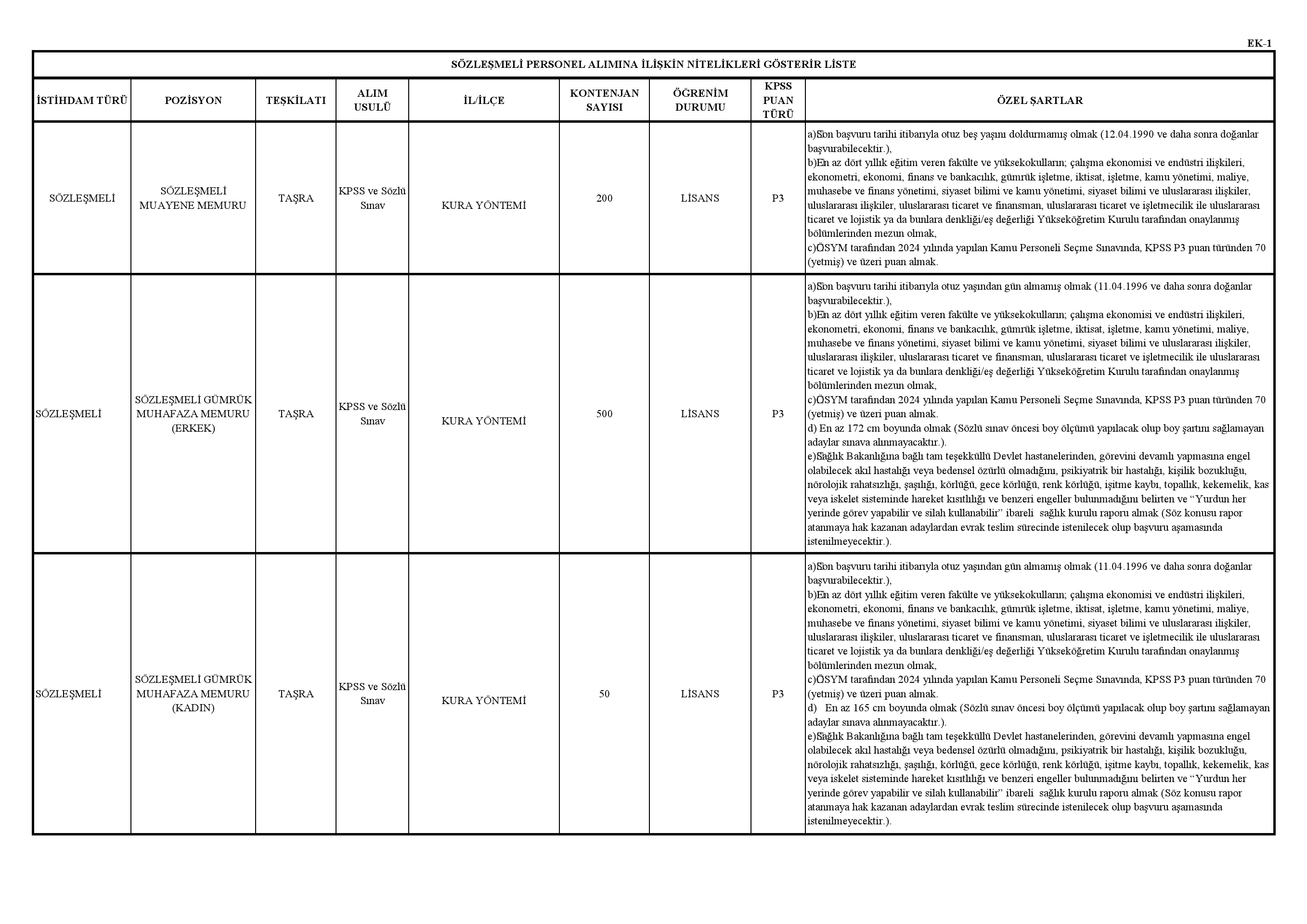 İstihdam edilecek sözleşmeli personelden 200'ü muayene memuru, 550'si gümrük muhafaza memuru, 3'ü ziraat mühendisi, 2'si makine mühendisi, 2'si inşaat mühendisi, 2'si elektrik mühendisi, 6'sı gıda mühendisi, 5'i tekstil mühendisi, 4'ü makine mühendisi, 4'ü kimya mühendisi, 1'i elektrik ve elektronik mühendisi, 1'i endüstri mühendisi, 30'u büro personeli, 20'si gemi adamı, 35'i şoför olacak.