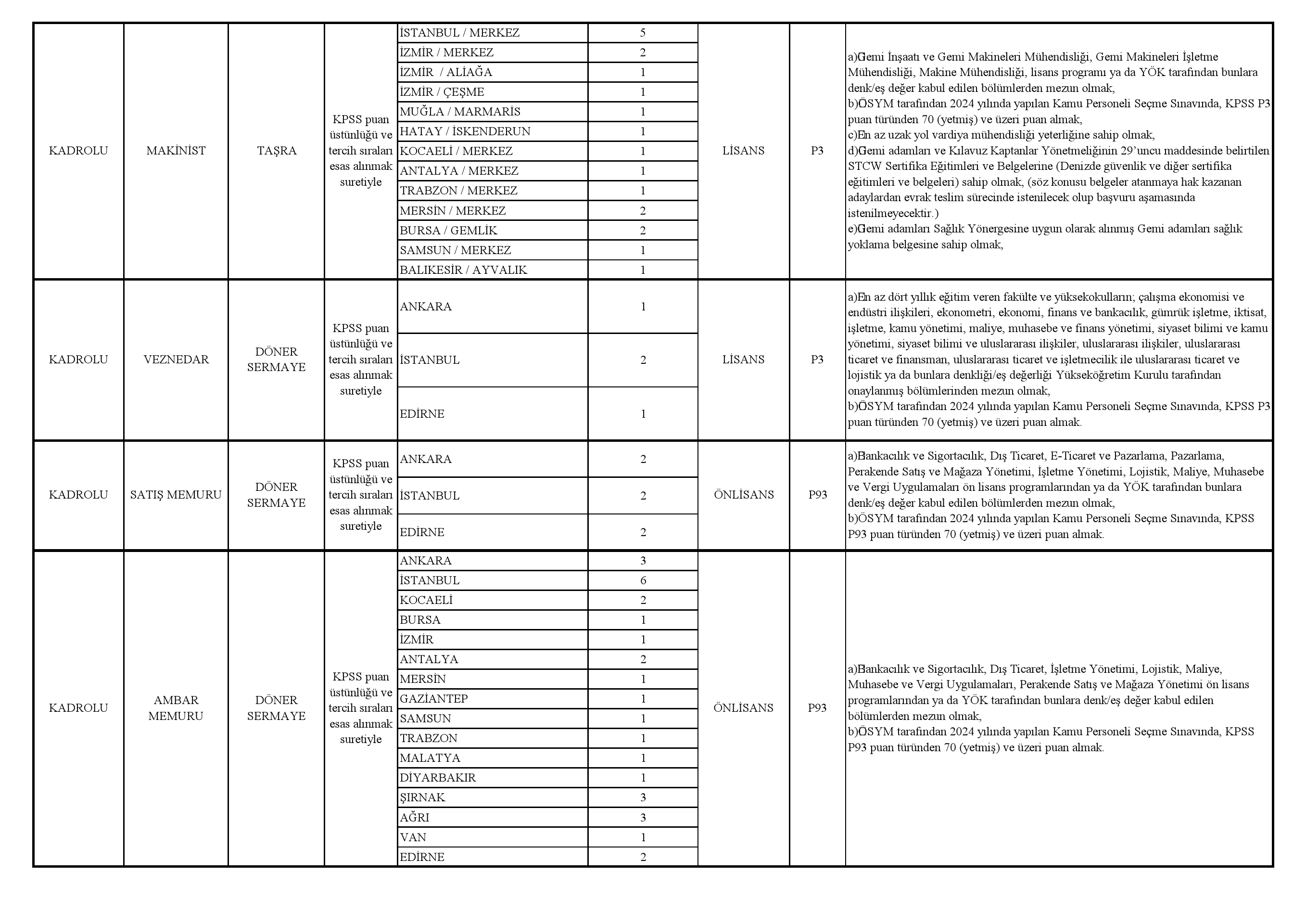 50 tüketici hakem heyeti raportörü, 13 kaptan, 20 makinist, 4 veznedar, 6 satış memuru, 30 ambar memuru ise kadrolu alınacak.
