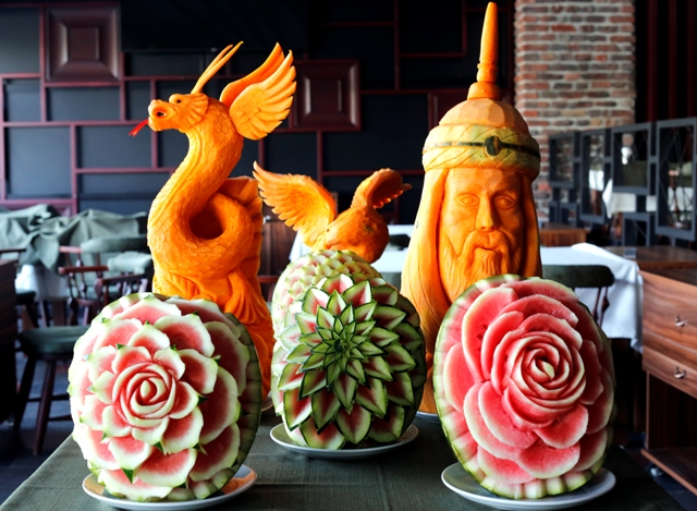 Turbu "kuğu"ya, kabağı "ejderha"ya, karpuzu da "kırmızı bir güle" dönüştüren Atlı, lezzet ile mideye, sanatı ile de gözlere hitap ediyor.