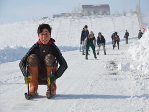 Muş’ta kar kalınlığının 1,5 metreye ulaşması vatandaşlar için çile, çocuklar için de eğlenceye dönüştü. Merkeze bağlı Yücetepe ve Taşoluk köylerindeki çocuklar, hafta sonunu fırsat bilerek bidon, korniş, hortum ve demir parçaları üzerinde kayarak eğlenceli dakikalar yaşadı. Kendi çabalarıyla hortum, korniş ve tahtaların altına demir parçası yerleştirerek kızak yapan çocuklar, soğuk havaya aldırış etmeden kayak keyfi yaptılar. Kornişten kızak yaparak kaymaya çalıştıklarını belirten Yücetepe köyünden Ahmetcan Güntay, kızak keyfi yaptıklarını söyledi. Hafta sonlarında kendi aralarında yarış düzenlediklerini ifade eden Güntay, “Bu kızaklarla kayıyoruz. Bu kızakları kendimiz kornişlerle yaptık. Bunlar bizim el emeğimizdir, yarışıp eğleniyoruz. Bazen kayıp, bazen ise düşüyoruz ama hep kayıyoruz” dedi.