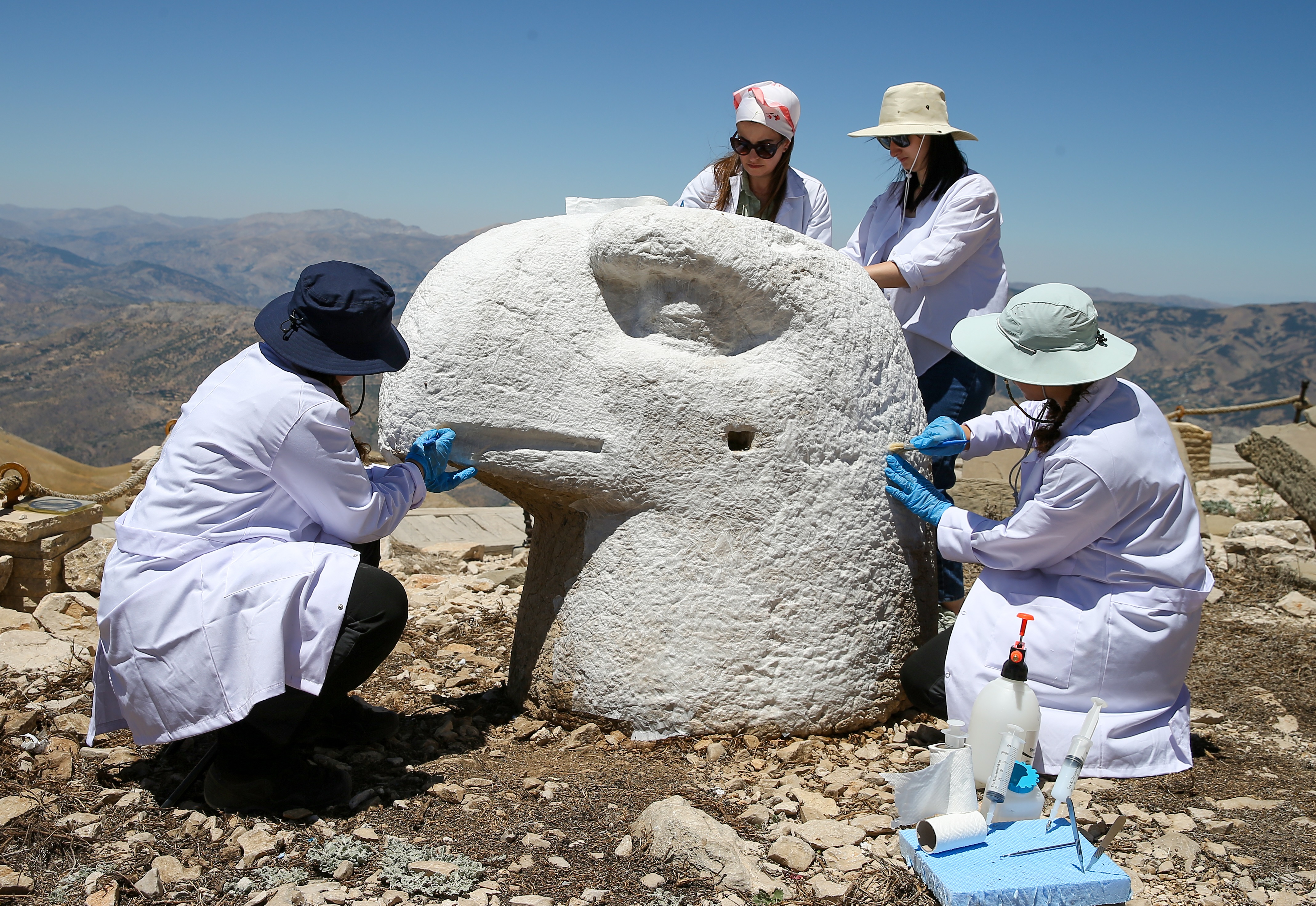 Bu kapsamda Gaziantep Restorasyon ve Konservasyon Bölge Laboratuvarı ile Adıyaman Müze Müdürlüğü ekiplerince yürütülen çalışmalarda bu yıl, Batı terasında yer alan ve Nemrut Dağı'nın simge eserleri olarak bilinen Kartal Başı ile Kral l. Antiochos'un heykelinde uygulamalara hız verildi.