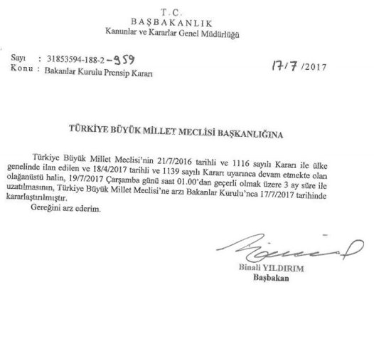Olağanüstü Hal'i (OHAL) 3 ay daha uzatan tezkere, TBMM Başkanlığı'na sunuldu.