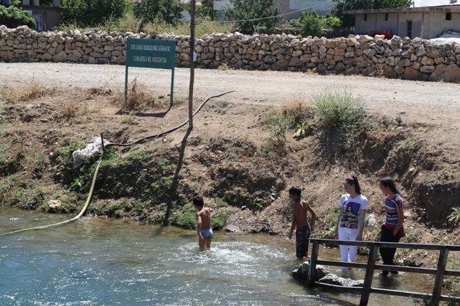 Sıcakların mevsim normallerinin üzerinde seyrettiği bölgede çocuklar, evlerinin önünden geçen sulama kanalına girerek serinlemeye çalışıyor. Etrafında çitlerin bulunmadığı ve sadece ‘Sulama kanalına girmek tehlikeli ve yasaktır’ ibaresinin yer aldığı kanala giren çocuklar, kendi yöntemleri ile yaptıkları can simitleri ile tehlikeye dalıyor. Pet şişeleri bellerine dolayıp suya giren çocuklar ölüme davetiye çıkarıyor.