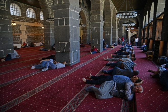 Diyarbakır’da son günlerde artan hava sıcaklıkları, oruçlu olan vatandaşların klimalı olan camilere akın etmesine ve burada uyumasına yol açtı. Bu mekanların başında tarihi Ulu Cami geliyor. Cami içinde ilgi çekici görüntüler oluşuyor. Bazı vatandaşlar, camilerin bu şekilde kullanılmasına tepkili.