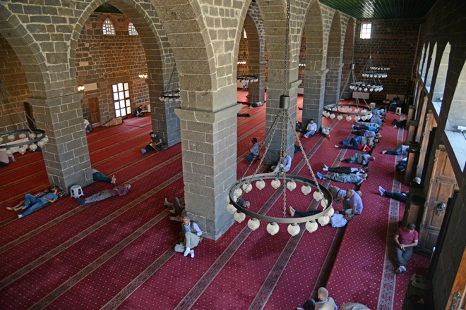 Diyarbakır’da son günlerde mevsim normallerinde seyreden sıcaktan bunalan oruçlu vatandaşlar, çareyi klimalı camilerde yatmakta buldu. Kentte, camilerde her Ramazan oluşan manzaralar bu yıl Ramazan‘ın ilk 25 gününde hava şartları iyi olduğu için yaşanmadı. Ancak son üç günde sıcakların yükselmesiyle vatandaşlar yeniden camilere yönelirken, eski bildik tablolar tekrarlandı. Vatandaşlar, başta Sur ilçesindeki tarihi Ulu Cami olmak üzere klimalı olan bazı camileri neredeyse otele çevirdi, ortaya çarpıcı manzaralar çıktı.