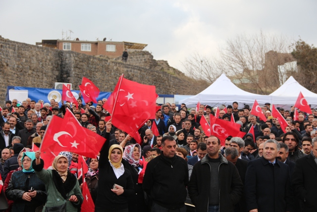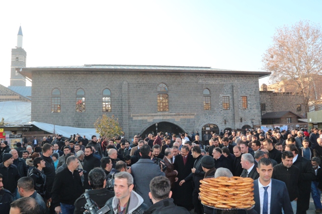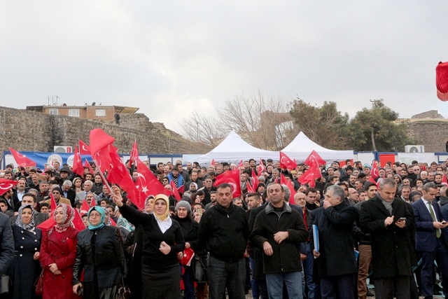 “Fakat biz bütün bunları yaparken, çalışırken, didinirken bir taraftan da yalanlar dinmek bilmiyor. Kara bir propaganda yapılıyor. Ben aylardır Sur’la uğraşıyorum. Ara sokaklarının ismine kadar Allah’a şükür biliyorum. Burada yaptığımız projeler doğru projeler ve her attığımız adım da nihayetinde övünebileceğimiz Sur’a gitmek için de bir adımdır. Bunları yaparken ilk günden başladılar; ‘Sur’da tehcir var. Buradaki yerler boşaltılıp zenginlere verilecek, iş merkezleri yapılacak. Burada hayat son bulacak, kimse yaşamayacak.’ Bunlara bir de Uluslar arası Af Örgütü eklendi. Verdikleri raporlarda da diyorlar ki, ‘%98’i kamulaştırıldı, vatandaşın elinden alındı buralar. Orada insanlar göçe tabi tutuldular ve karşılıkları, bedelleri de verilmiyor.’ Arkadaşlar, bütün bu yalanlar arka arkaya söyleniyor. El insaf ya! Aylardır burada neler yaptığımıza sizler şahitsiniz.
