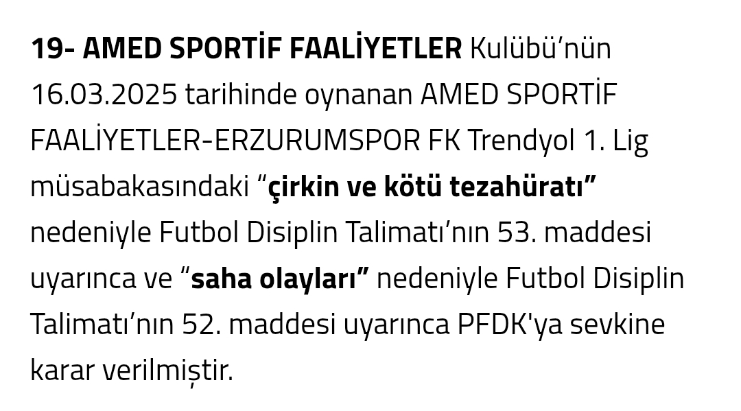 "AMED SPORTİF FAALİYETLER Kulübü’nün 16.03.2025 tarihinde oynanan AMED SPORTİF FAALİYETLER-ERZURUMSPOR FK Trendyol 1. Lig müsabakasındaki “çirkin ve kötü tezahüratı” nedeniyle Futbol Disiplin Talimatı’nın 53. maddesi uyarınca ve “saha olayları” nedeniyle Futbol Disiplin Talimatı’nın 52. maddesi uyarınca PFDK'ya sevkine karar verilmiştir."