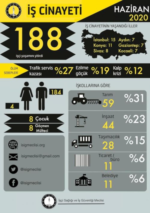 TİGRİS HABER - İşçi Sağlığı ve İş Güvenliği Meclisi (İSİG) 2020 yılının ilk altı ayındaki iş cinayetlerini raporlaştırdı. Rapora göre 2020 yılında yaşanan iş cinayetlerinin aylara göre dağılımı şöyle: Ocak ayında en az 114 işçi, şubat ayında en az 133 işçi, mart ayında en az 113 işçi, nisan ayında en az 221 işçi, mayıs ayında en az 165 işçi ve haziran ayında en az 188 işçi yaşamını yitirdi.
