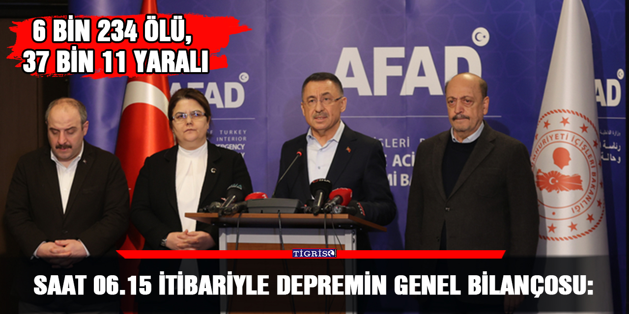 AFAD, saat 06.15 itibarıyla Kahramanmaraş merkezli depremlerde 6 bin 234 kişinin hayatını kaybettiğini, 37 bin 11 kişinin yaralandığını açıkladı.
