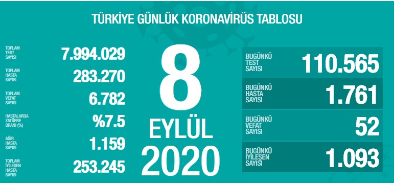 TİGRİS HABER - Sağlık Bakanı Fahrettin Koca, sosyal medya hesabından: “Bugün 110.000’den fazla test yapıldı ve 1.761 yeni hasta tespit edildi. Ağır hasta sayımız artmaya devam ediyor. Kayıplarımız can yakıyor. Bu durumu durduracak olan birlikte tedbirlere uymaktır. Güç birlikte tedbirde” ifadelerini kullandı.