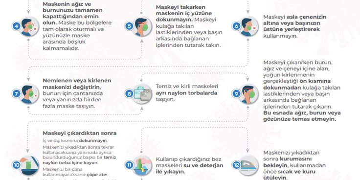 TİGRİS HABER - Bez maskelerle bilgilendirme yapan Sağlık Bakanlığı maskenin kişiye özel olması, her bireyin sadece kendisine ait olan maskeyi kullanması gerektiğini belirtti. Resmi Twitter hesabından paylaşım yapan Sağlık Bakanlığı’nın yayınladığı grafikte şu uyarılarda bulunuldu: