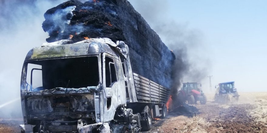 Mardin'in Kızıltepe ilçesinde saman yüklü tır, yanarak kullanılmaz hale geldi.