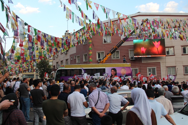 Yüksek Seçim Kurulu (YSK) tarafından seçim sonuçlarının yayınlanması üzerindeki yasağı kaldırılmasının ardından ilk seçim sonuçları açıklanmaya başlarken, HDP Diyarbakır il binası önünde toplanan kitle halaylar eşliğinde seçim sonuçlarını takip etmeye başladı.