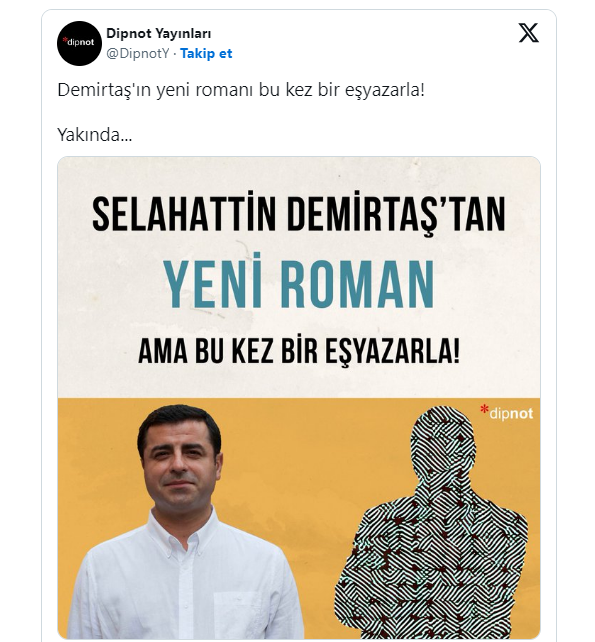 Dipnot Yayınları, ismini gizli tuttuğu yeni romanı "Demirtaş'ın yeni romanı bu kez bir eşyazarla!" notuyla duyurdu.