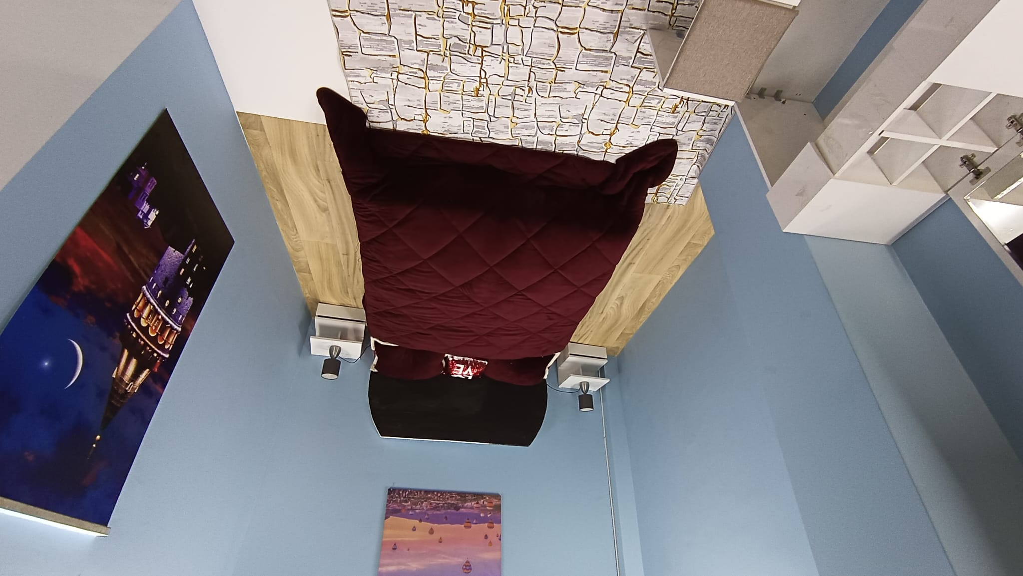 Oda, salon ve mutfakta yer alan masadan, sandalye, ocak ve buzdolabına, koltuklardan, kilim, halı ve yatak takımına kadar evdeki bütün eşyalar evin tavanında, kafasının üzerinde görenleri şaşırtıyor.