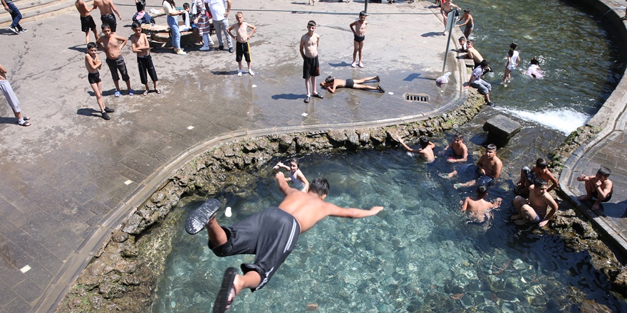 Bazı çocukların tehlikeli olmasına rağmen suya atladığı görülürken, havuzdan çıkan çocuklar beton zemine uzanıp, güneşlendi. Süs havuzunda serinlemeye çalışan çocuklardan Şehmus Papatya (13), arkadaşlarıyla havuzda yüzdüğünü ve mutlu olduğunu söyledi. (AA)