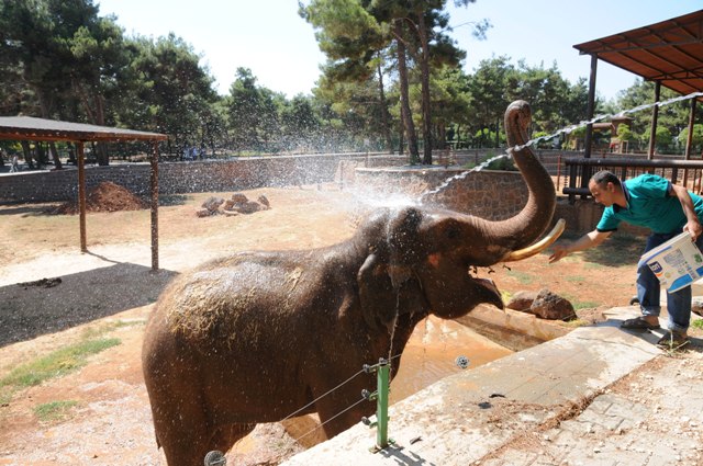 Türkiye'nin en büyük hayvanat bahçelerinden Gaziantep Hayvanat Bahçesi'ndeki hayvanların büyük kısmı sıcak nedeniyle barınaklarındaki gölgeliklerde serinliyor. Hayvanat bahçesinin en eski misafirleri arasında yer alan 10 yaşındaki 'Pili' ve 'Gabi' isimli filler ise serinlemek için çamur banyosu yapıyor. Bakıcıları tarafından günde 5-6 defa düzenli olarak sulanan filler, vücutlarındaki nemin kalması için barınaklarındaki çamur havuzlarına çamura bulanıyor. Keçi boynuzu ve mısır gibi yüksek enerjili gıdalarla beslendikten sonra barınaklarındaki çamur havuzlarında saatlerce oynayan filler serinliyor.