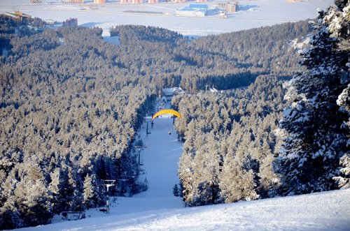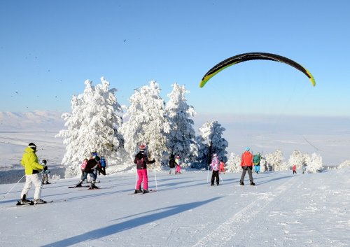 KARS - Türkiye'nin önemli kayak merkezleri arasında yer alan Cıbıltepe Kayak Merkezi'nde, profesyonel pilotlar tarafından, sıfırın altında 25 derecede ilk kez yamaç paraşütü yapıldı. Kristal kar, sarıçam ormanları ve uzun kayak pistleriyle gözde kayak merkezlerinden biri olan Cıbıltepe, kayak, snowboard ve kızağın yanı sıra ilk kez yamaç paraşütçülerine ev sahipliği yaptı. Muğla, Fethiye, Ölüdeniz gibi önemli turizm merkezlerinde yamaç paraşütüyle uçuşlar gerçekleştiren profesyonel pilotlar Medeni Akın ve Yavuz Aslan, bir turizm şirketinin daveti üzerine Sarıkamış'a geldi. Cıbıltepe'nin 2 bin 634 rakımlı zirvesinde, hava sıcaklığının sıfırın altında 25 derece olmasına rağmen iki kez uçuş denemesi yapan pilotlar, üçüncü denemede havalanabildi.