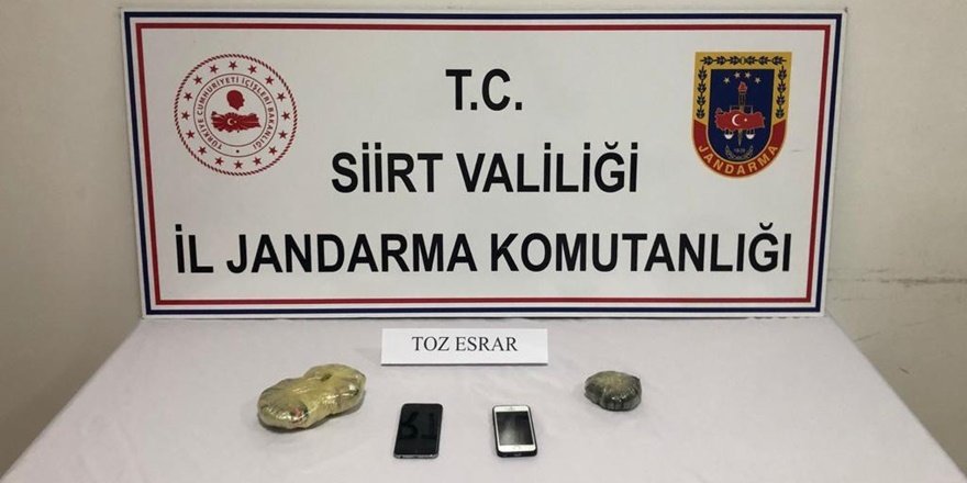 Siirt Valiliğinden yapılan açıklamada, İl Jandarma Komutanlığı ekiplerince Batman-Kurtalan karayolu üzeri Gürgöze köyü girişinde haksız kazanç elde etmek maksadıyla uyuşturucu madde ticareti yaptıkları tespit edilen şahıslara yönelik operasyon düzenlendiği belirtildi. Açıklamada, "İl Jandarma Komutanlığı ekiplerince, şüphelilerin içerisinde bulunduğu araçta ve şüphelilerin üzerinde yapılan arama sonucu aracın çeşitli yerlerine gizlenmiş vaziyette 2 parça halinde 500 gram toz esrar maddesi ve şüphelilere ait 2 adet cep telefonu ele geçirilmiş olup, şüpheliler S.A ve E.K. suç unsuru malzemeler ile birlikte yakalanmıştır. Adli işlemlere başlanılarak şüpheliler gözaltına alınmıştır" denildi. (İHA)