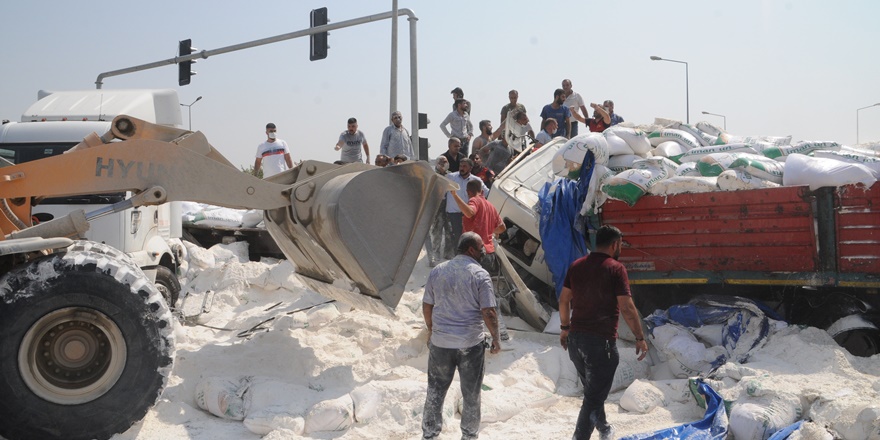 Yola savrulan un çuvalları ve kazaya karışan araçların yoldan kaldırılması için çalışma başlatıldı.