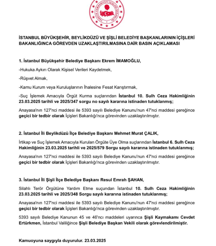 1. İstanbul Büyükşehir Belediye Başkanı Ekrem İmamoğlu, hukuka aykırı olarak kişisel verileri kaydetmek, rüşvet almak, kamu kurum veya kuruluşlarının ihalesine fesat karıştırmak, suç işlemek amacı ve örgüt kurma suçlarından İstanbul 10. Sulh Ceza Hakimliği'nin 23.03.2025 tarihli ve 2025 Taksim 347 Sorgu No sayılı kararlı istinaden tutuklanmış, Anayasanın 125. maddesi ile 5393 sayılı Belediye Kanunu'nun 47. maddesi gereğince geçici bir tedbir olarak İçişleri Bakanlığınca görevden uzaklaştırılmıştır.