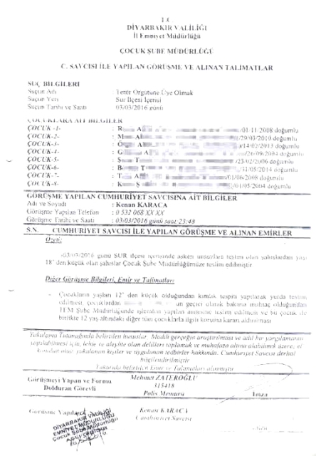 Çocuk Şube Müdürlüğü tarafından teslim alınan 12 yaşındaki K.Ş. ve G.A., 10 yaşındaki Ş.T., 8 yaşındaki T.A. ile R.A., 6 yaşındaki M.A., 3 yaşındaki Ö.A. ve 2 yaşındaki B.T. hakkında Cumhuriyet Savcısı Kenan Karaca’nın Diyarbakır Emniyeti’ne verdiği talimatların tutanağında çocukların yurda teslim edilmesi, içlerinden 2 yaşındaki B.T.’nin bakıma muhtaç olduğu için Terörle Mücadele Şube Müdürlüğü’nde işlemleri yapılan annesine teslim edilmesi gerektiği belirtiliyor.