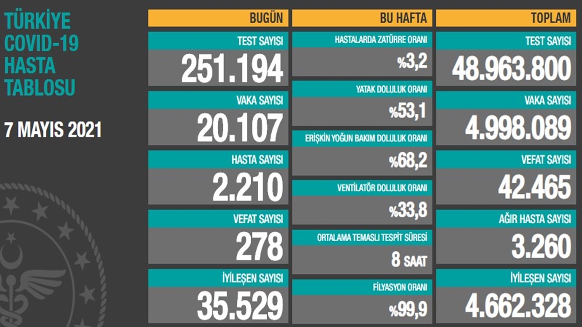 TİGRİS HABER - Sağlık Bakanlığı'nın bilgilendirme sayfasında Türkiye’nin güncel koronavirüs tablosu paylaşıldı. Türkiye'de son 24 saatte 251 bin 194 Kovid-19 testi yapıldı, 20 bin 107 kişinin testi pozitif çıktı, 278 kişi hayatını kaybetti. (Haber Merkezi)