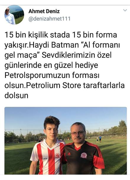 Vali Deniz, sosyal medya üzerinde yaptığı paylaşımla Batman halkını Petrolspor’a maddi ve manevi destek sağlamaya çağırdı. Oğlu ile beraber poz veren Vali Deniz,Batmanlılardan hem kulübün lisanslı ürünlerini alarak kulübe maddi destek sağlamalarını hem de ligin ilk haftasındaki Şanlıurfa Karaköprü Belediyespor maçıyla hizmete girecek yeni Batman stadına formalarla gelerek görsel şov oluşturmalarını istedi.